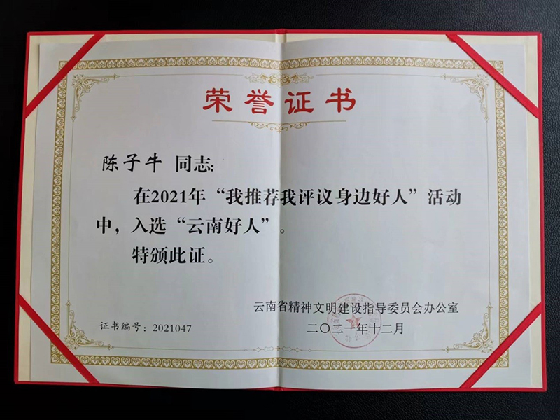在各州市文明办、有关部门(单位)推荐2021年度“云南好人”候选人的基础上,云南省文明办组织召开评审会,评出2021年度“云南好人”名单,共计81组,分为助人为乐、见义勇为、诚实守信、敬业奉献和孝老爱亲五大组。陈子牛老师获得敬业奉献荣誉称号。