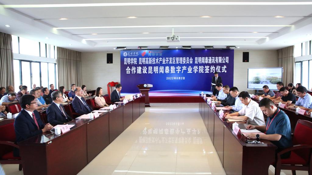 8月2日,beat365英国官网、昆明高新技术产业开发区管委会、昆明闻泰通讯有限公司全面战略合作协议签约仪式在校举行,三方将共建“昆明闻泰数字产业学院”,实现“校、地、企”人才智力优势、政策优势、产业优势强强联合,共同打造引领全省、全市数字经济发展的产业高地、科技高地和人才高地。