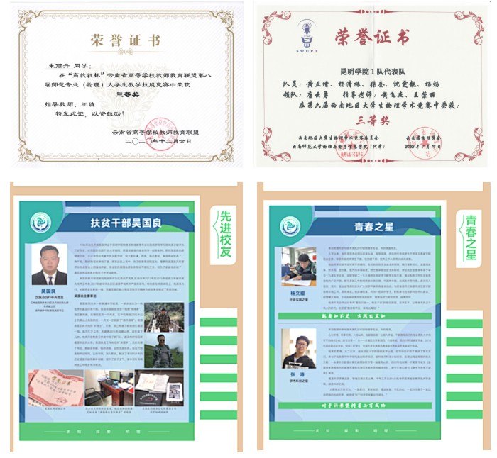 学院落实立德树人根本任务,构建“六位一体”育人队伍,凝聚“三全育人”合力,坚持为党育人、为国育才。人才培养注重理想信念教育、厚植家国情怀,涌现出一批以公映电影《青春不悔》主角原型——全国脱贫攻坚先进个人、云南省优秀共产党员吴国良同志等为代表的优秀毕业生。支持、鼓励并指导学生参加专业技能竞赛、学术活动和社会实践活动,参加校级以上各种比赛获奖100余人次,其中获国家级奖项4项、省级奖项30余项。考研人数和升学率逐年提高,2022届毕业生物理学专业考研录取升学率达21%,创历年升学率新高,毕业生赴四川大学、兰州大学、华中师范大学、山西大学、西北大学、广西大学、云南大学、成都理工大学等知名高校深造。就业服务与思想政治教育有机结合,将“扎根边疆、自强不息、艰苦奋斗、甘于奉献”的教育理念融入人才培养全过程,部分毕业生到云南、四川、广西、新疆、西藏等西部学校任教,人才培养质量赢得社会认可,为边疆教育事业发展作出贡献。
