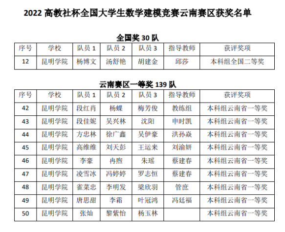 近日,云南省大学生数学建模竞赛组委会发文公布了“2022高教社杯全国大学生数学建模竞赛”获奖名单,beat365参赛的129支队伍中有50支队伍获奖,其中,信息工程学院杨文博、汤淑艳、胡建金三位同学在邱莎老师指导下获得全国二等奖。