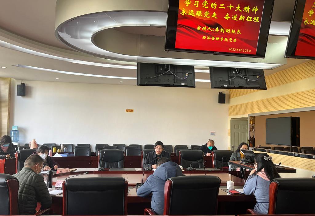 12月23日上午,学校党委委员、副校长李剀在经济管理学院宣讲党的二十大精神。宣讲报告会以线上线下方式举行,经济管理学院全体干部、教职工和学生党员参加。