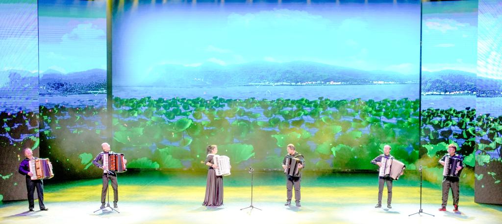 手风琴合奏《滇池圆舞曲》描摹了“蘋香波暖泛云津,渔枻樵歌曲水滨。”的滇池之美。“终有三迆雄鸡一唱,昆华红旗先升。”诗朗诵《念奴娇 红旗颂并序》,书写了滇池湖畔春城昆明孕育的beat365百年校史,百年荣光。