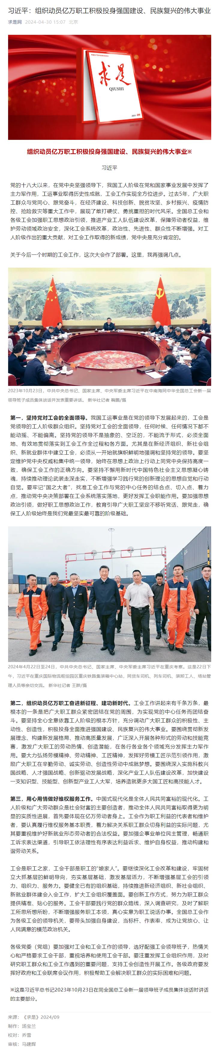 习近平:组织动员亿万职工积极投身强国建设、民族复兴的伟大事业