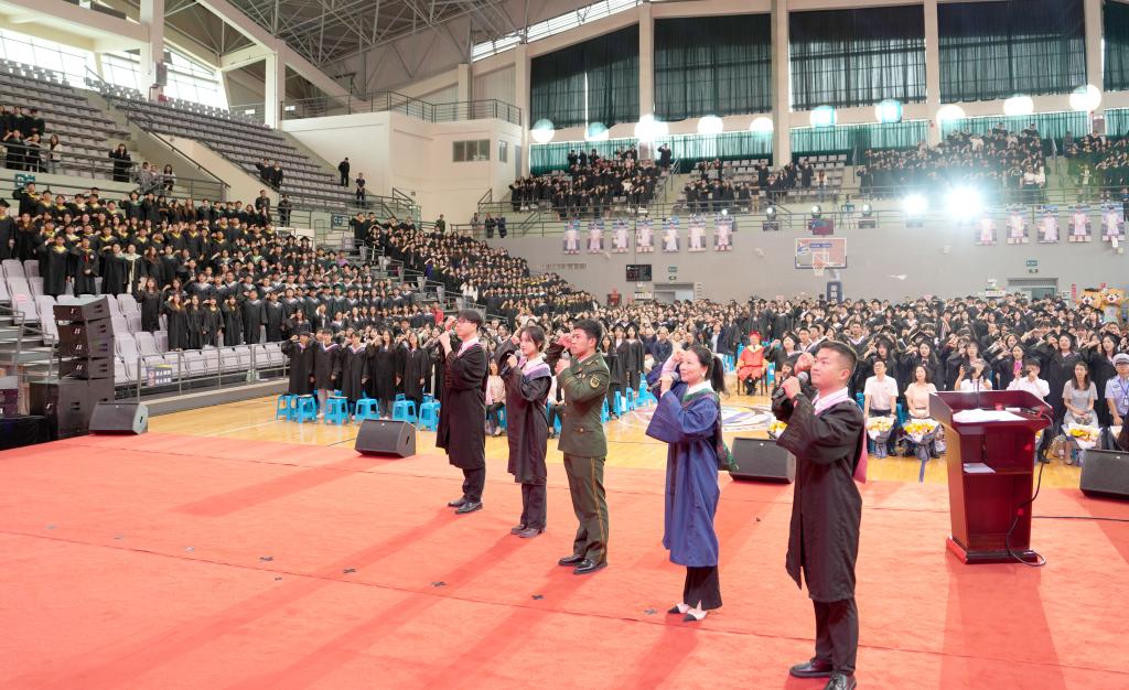 全体毕业生在领誓人的带领下庄严宣誓,将用聪明和才智奉献社会,以青春和热血报效祖国。