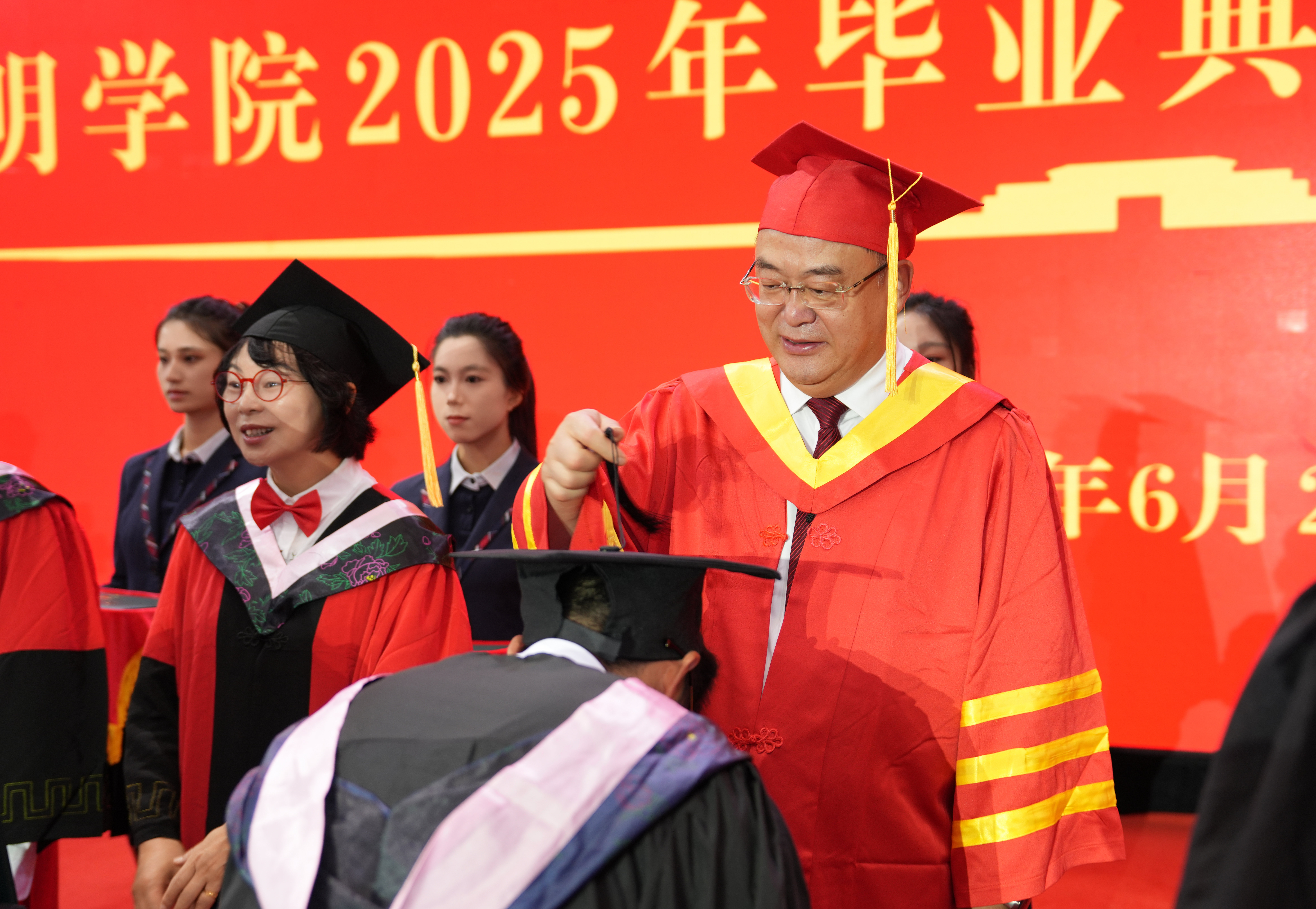 王凡宣读2025届beat365英国官网全日制硕士毕业生、本科毕业生毕业资格和学位授予决定。全体校领导为硕士毕业生、本科毕业生代表颁发毕业证书、行拨穗礼并授予学位证书。