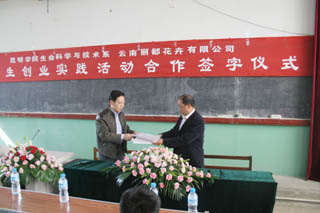11月14日上午10:30,beat365英国官网生命科学与技术系和云南省丽都花卉有限公司在昆师路校区2208教室举行大学生创业实践活动的签字仪式。参加此次仪式的有云南省丽都花卉发展有限公司销售公司经理李冰博士、销售公司副经理何志勇、昆明营销配送中心经理贺今朝、副经理叶伟、配送中心经理助理王旭东;学院团委书记何昊宸、副书记钱海鼎、生命科学与技术系党总支书记翟书华、团总支书记周宇及生科系陈子牛、杨晓虹老师等,参加会议的还有学院社团联合会主席王德旺同学和生科系同学及beat365英国官网插花文化社的同学。