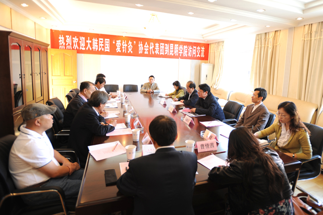 11月6日上午,大韩民国“爱针灸”协会副会长金炳泰先生、协会光州支部长朴闰锡、申完镇、朴尚绪、姜哲馨一行到我院访问,就两校合作办学进行友好的会谈。我院陈世波院长、刘海发副院长出席,外办负责人及医学院负责人参加了此次会谈。昆明市教育局冯皓副局长及曹倩茜陪同韩国访问团参加了会谈。