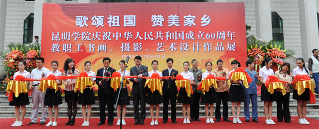 我院庆祝中华人民共和国成立60周年— “歌颂祖国、赞美家乡”教职工书画、摄影、艺术设计作品综合展于9月19日上午在云南省图书馆隆重开幕。我院陈世波院长、李媛芬副书记、刘海发副院长,省教育厅相关部处领导,昆明市委宣传部、统战部部务委员,市人事局、财政局、市教文卫工会等领导出席开幕式。参加开幕式的还有学院中层干部和相关系师生代表400余人。开幕式由李媛芬副书记主持。