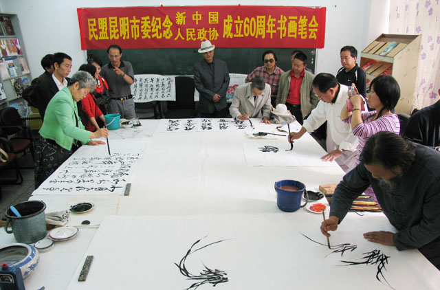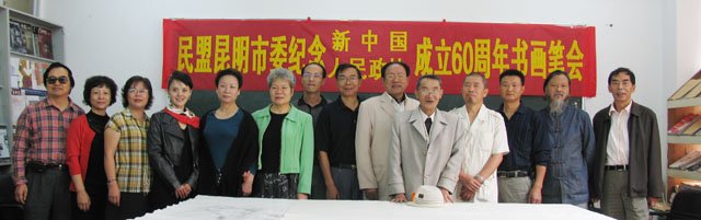 为庆祝新中国和政协成立60周年,表达民盟昆明市盟内书画艺术家的爱国情怀,展示民盟昆明市盟内书画艺术家的书画艺术,切磋盟内书画艺术家们的创作技艺,由民盟昆明市委组织的“庆祝新中国和政协成立60周年书画笔会”于8月20日在我院美术与艺术设计系举行。 省政协委员、民盟云南省委常委、民盟省委文教专委会主任、云南艺术学院副院长潘红教授,云南省社会服务部部长薛继光,中共昆明市统战部党派处处长万绍斌,民盟昆明市委副主委张惠椒、冯刚,民盟昆明市委秘书长周群,云南画院画家杨正国以及盟内书画艺术家黄片石、武新文、朱仲元、王树华等领导和书画艺术家应邀出席了本次书画艺术笔会。应邀出席本次书画艺术笔会的还有民盟云南省委、民盟昆明市委机关的干部、我院党委统战部长、美术与艺术设计系主任和部分师生、社区干部20余人。 潘红教授和张惠椒副主委先后在会上发表了热情洋溢的讲话,鼓励书画艺术家们以庆祝中华人民共和国成立60周年和政协成立60周年为契机,用自己的丹青画笔抒发爱国主义情怀,发挥书画艺术在陶冶情操、构建和谐社会中的重要作用。 随后,书画艺术家以匠心独运的风格和十分流畅的笔墨创作了30余幅书画作品,以书画形式浓墨重彩歌盛世,受到了在场的领导和师生的赞扬和好评。 本次书画艺术笔会在我院举行,加深了省市盟内书画艺术家对beat365英国官网的了解,促进了院内外书画艺术家的友谊,对提升beat365英国官网美术专业的教学水平必将产生积极的推动作用。