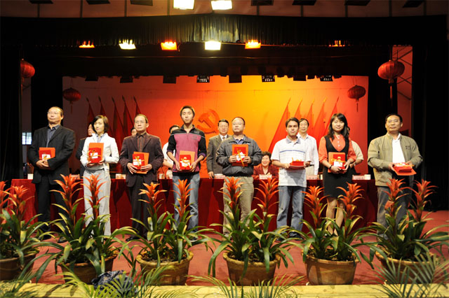 院党委副书记孙勇同志宣读了学院党委《关于表彰2009年度开展“三个一在校园”主题实践活动百名优秀共产党员的决定》。一年来,全院广大共产党员在党委的带领下,齐心协力、尽职尽责、努力工作,认真践行“个人形象一面旗,工作热情一团火,谋事布局一盘棋”的要求,较好地发挥了先锋模范作用,教学、科研、管理、服务等各个岗位涌现出一大批表现突出的共产党员。经过各党总支、直属党支部的认真评选和院党委研究,成绩突出的102名同志被授予“优秀共产党员”称号。在热烈的掌声中,学院党委领导共同为受表彰的优秀共产党员代表颁发了荣誉证书。