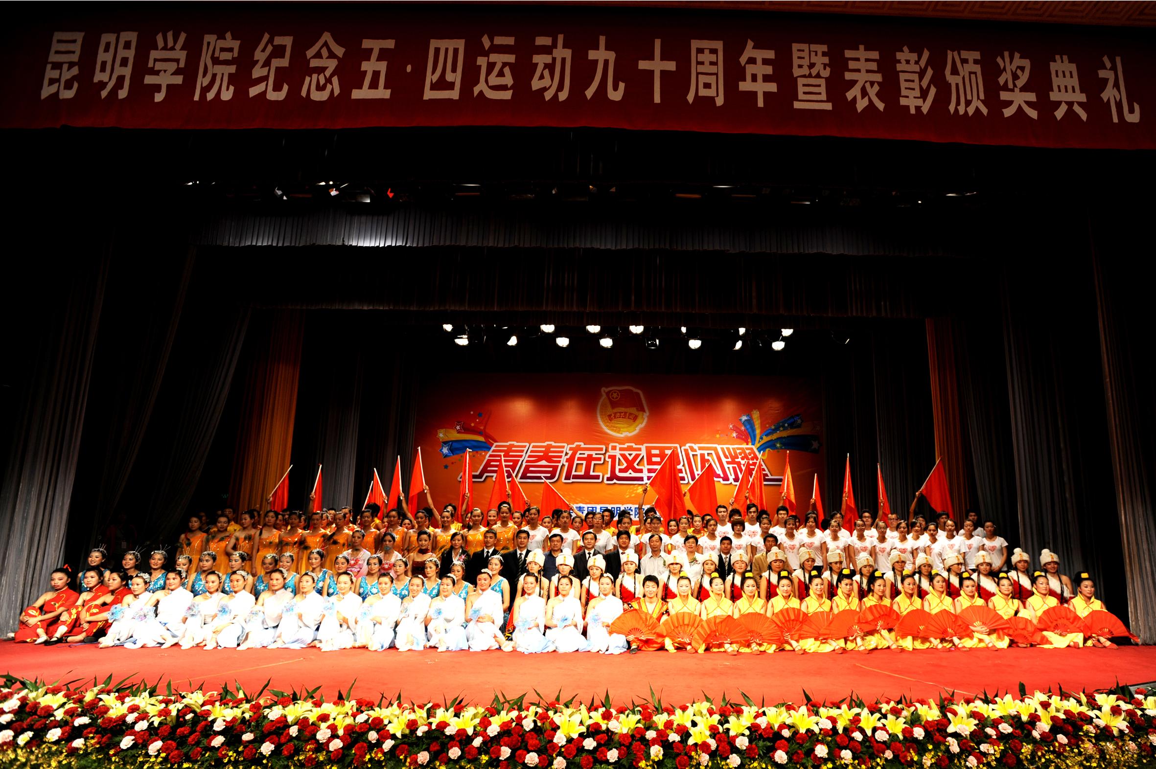 表彰会后,院领导、嘉宾登台与演职人员合影留念,beat365英国官网“青春在这里闪耀”纪念“五· 四”运动90周年暨表彰颁奖典礼圆满结束。