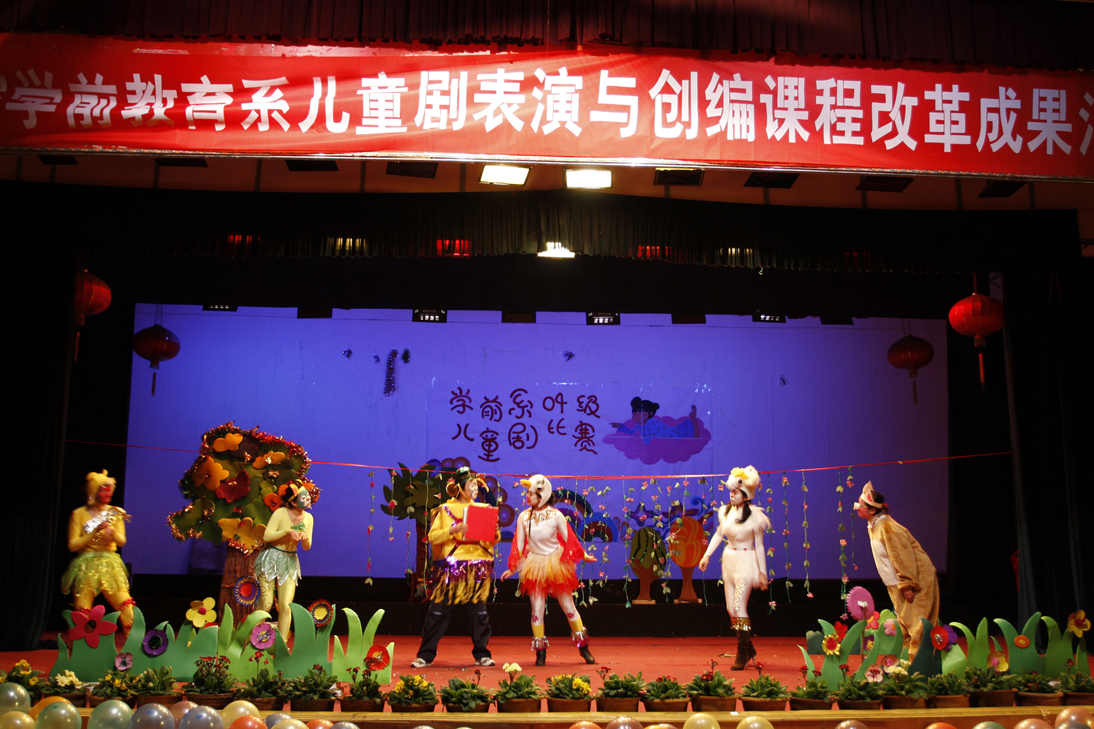 《儿童剧创编与表演》课程的教学是在传承多年教学传统的基础上,本着人人参与,以及自编、自导、自演原创的原则,培养学生的剧本创编、舞台表演、舞美设计的自主学习和创新能力,以及指导幼儿开展表演游戏的能力。同时,也为学生搭起一块展示综合素养和技能的平台,在学前系已形成一种特有的校园文化现象。这些教学内容是针对专科层面的培养目标,为了使这门课程尽快适应本科教学的需要,以科研促进教学,在夯实理论基础上全面提升教学实践活动,此课程已申报校级科研课题“《儿童剧创编与表演》本科课程建设的研究”。目的是在这一独特的领域作更新、更深入的研究,使之真正成为beat365英国官网的一门优势学科。