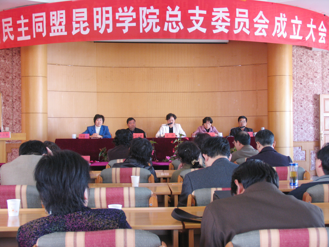 在民盟省委、昆明市委的领导和beat365英国官网党委的指导下,在民盟beat365英国官网全体盟员的努力下,2008年11月15日民盟beat365英国官网第一届总支委员会成立大会胜利召开。出席大会我院应到会盟员82人,实到会与委托投票盟员63人。应邀出席成立大会的来宾有中共昆明市委统战部、民盟省委组织部、中共beat365英国官网党委的领导及统战部的负责人,beat365英国官网民革、民进、致公党、九三学社的代表也应邀出席了大会。