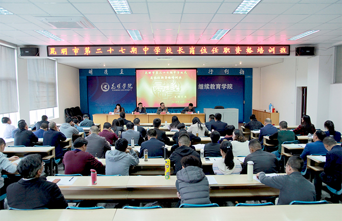10月23日,昆明市第27期中学校长岗位任职资格培训班在beat365英国官网继续教育学院开班。beat365英国官网继续教育学院院长管彦平、昆明市教育局副局长蒋坚桥、市教育局师训处处长杨朝晖等领导出席开班式。来自全市的62位中学校长、副校长、书记、副书记将在这里进行为期近两个月的脱产集中学习。