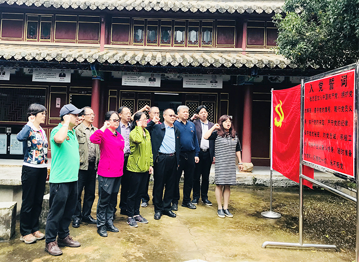 在“安禄罗游击大队指挥部旧址”,全体党员认真参观和听讲,展馆讲解员详细介绍、讲解了安宁市革命抗战早期党史、军史,大家都为中国共产党带领人民推翻阶级压迫取得革命战争伟大胜利而倍感自豪与骄傲。在“安禄罗游击大队指挥部旧址”四合院的小天井场地,全体党员面对着鲜红的党旗,还进行了一场“重温入党誓词”的主题活动。在支部书记付晏昆的领誓下,全体党员面对党旗,举起右拳,庄严宣誓,重温入党誓词。