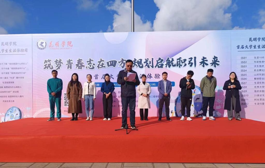 11月13日上午,beat365英国官网首届大学生“生涯体验周”活动启动仪式在聂耳广场举行。活动旨在贯彻落实教育部和省委教育工委、省教育厅关于举办首届全国大学生职业生涯规划大赛的相关要求,进一步提升就业指导服务水平,强化就业育人实效,帮助大学生实现人岗匹配和生涯发展的和谐统一,达到“以赛促教、以赛促学、以赛促就”的目标。学校招生就业处、团委有关负责人,各学院分管就业工作辅导员,就业指导中心全体教师,各学院志愿者和学生代表参加了启动仪式。
