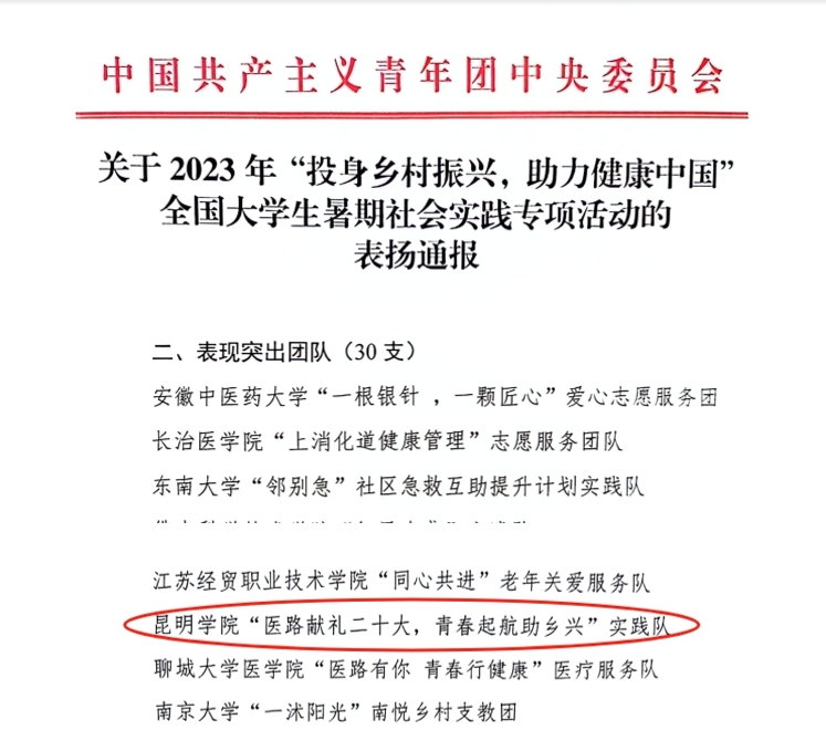 近日,共青团中央青年发展部发布了《关于2023年“投身乡村振兴,助力健康中国”全国大学生暑期社会实践专项活动的表扬通报》,对在活动中为建设健康中国、投身乡村振兴作出积极贡献、表现突出的实践单位、团队和个人进行表扬。beat365英国官网“医路献礼二十大,青春起航助乡兴”实践队凭借其在实践活动中的卓越表现,成功入选“表现突出团队”名单。