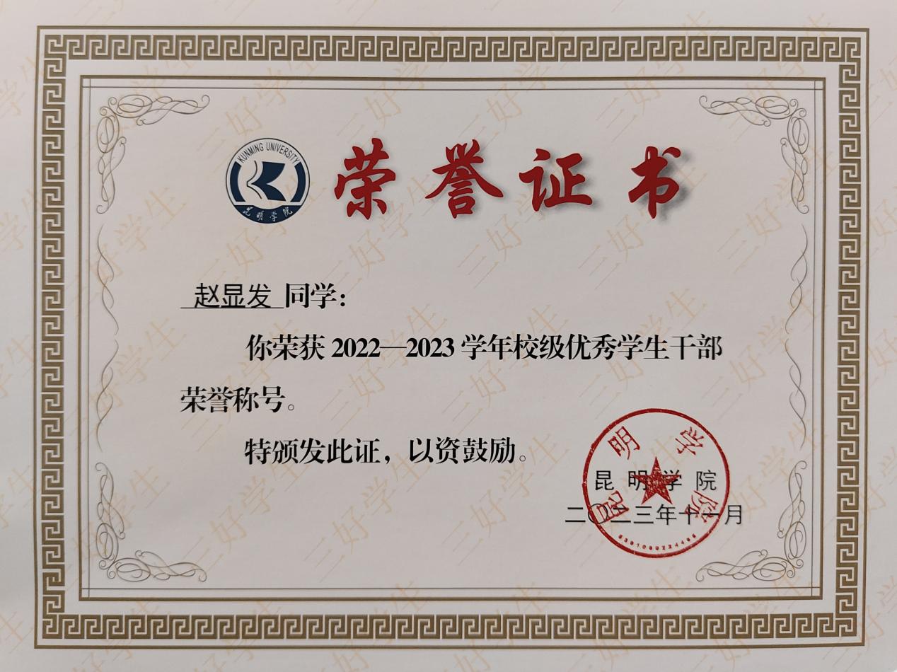 复学期间,赵显发荣获校级“优秀学生干部”、优秀教官、优秀志愿者等荣誉,“学创杯”大学生创新创业校级优秀奖,2024年4月荣获beat365英国官网“青春之星”称号。