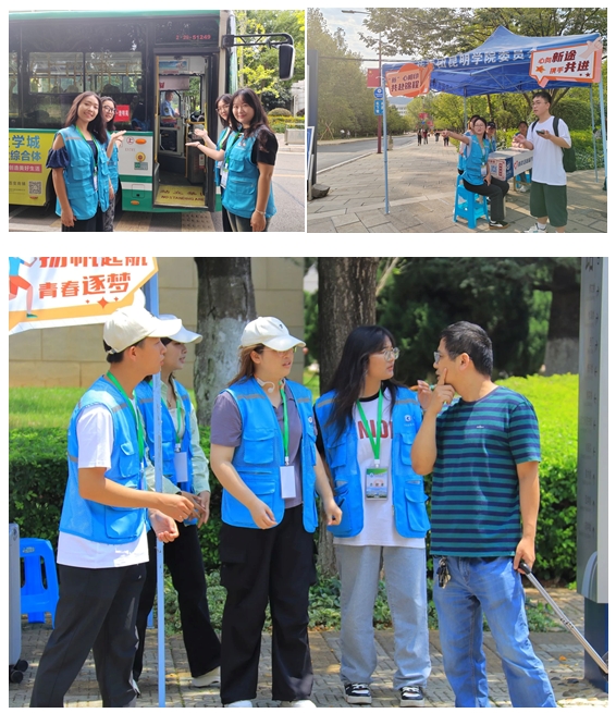 迎新当天,校园内各个重要点位都有青年志愿者为新生和家长讲解校园、解疑答惑、搬运行李……全心全意为新同学排忧解难。校园公交车上,青年志愿者热情地接过行李,为新同学们讲述途经的校园风景,介绍关于校友聂耳的文化故事,分享校园生活,青年志愿者耐心地讲解、细心地引路、不遗余力地帮忙,通过一系列迎新服务,为新同学提供了全面而细致地帮助,确保新生能够顺利融入校园生活。