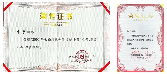 学院辅导员乔予荣获“2020年云南省最美高校辅导员”称号,并获得2022年beat365英国官网“最美昆院人辅导员奖”。