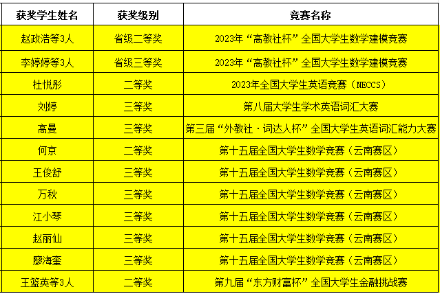 各专业培养目标定位符合云南省16个地州(市)的产业发展和基础教育发展需要,各专业生源充足、质量良好,毕业生的职业素养和专业能力受到用人单位的广泛好评;本科生升学率也创新高,2022届有25名同学考上硕士研究生,2023届有28名同学考上硕士研究生,2024届有33名考上硕士研究生,升学率达到22.03%,学院力推的高质量就业成效显著。学生在各类专业竞赛、创新创业大赛、文体竞赛等活动中成绩优异,近三年获各类奖励及项目26余项,特别是全国大学生数学建模竞赛、大学生创新创业大赛、挑战杯电子设计大赛、教学技能和教具制作竞赛等竞赛中取得了较优异的成绩。