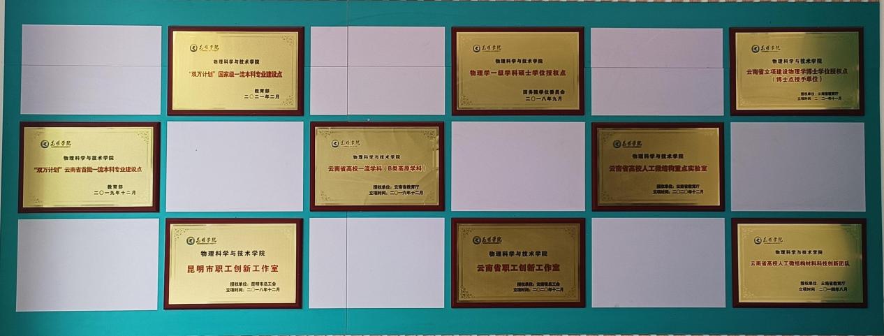 物理学专业2016年被评为云南省高校一流学科(B类高原学科,同类高校排名第一);2018年获批物理学硕士学位(一级学科)授权点,并于2019年正式招生,2021年获批物理学博士学位授权点培育立项建设。2019年入选首批“双万计划”省级一流本科专业建设点,2020年入选“双万计划”国家级一流本科专业建设点,2022年顺利通过师范专业第二级认证。2020年“固体物理学”课程入选云南省首批本科一流课程。2022年云南省本科专业综合评价为C+(2/12),排名云南省第二。学院现有“云南省高校人工微结构科技创新团队”1个,云南省“硕士研究生导师团队”1个,云南省职工创新工作室1个,“云南省高校人工微结构重点实验室”1个。
