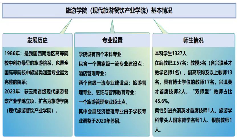 学科专业建设成效显著。2023年开始招收旅游管理专业硕士(MTA)研究生。现有3个专业中,酒店管理是国家级一流本科专业建设点及省级立项的冲B专业;旅游管理、烹饪与营养教育专业是省级一流专业建设点。软科2024年中国大学专业排名中,烹饪与营养教育和酒店管理排名层次为B+,旅游管理排名层次为B。与瑞士SEG教育集团合作,引入8门国际课程,完成19名教师国际师资认证。目前在全力迎接新一轮教育教学审核评估的同时,3个专业均已启动UNT国际认证。