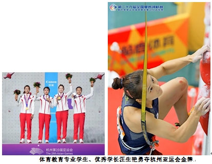 体育学院充分发挥专业特色与优势, “以赛促融、以赛促建”,开启学院高质量发展新篇章。近三年,参加国际、国家、省部厅级比赛获一等奖60余项,其中学校优秀学子、体育教育专业2021级学生汪生艳在2023年第十九届杭州亚运会上夺得攀岩项目女子组团体速度接力赛金牌,为祖国和人民赢得荣誉,为母校增光添彩。