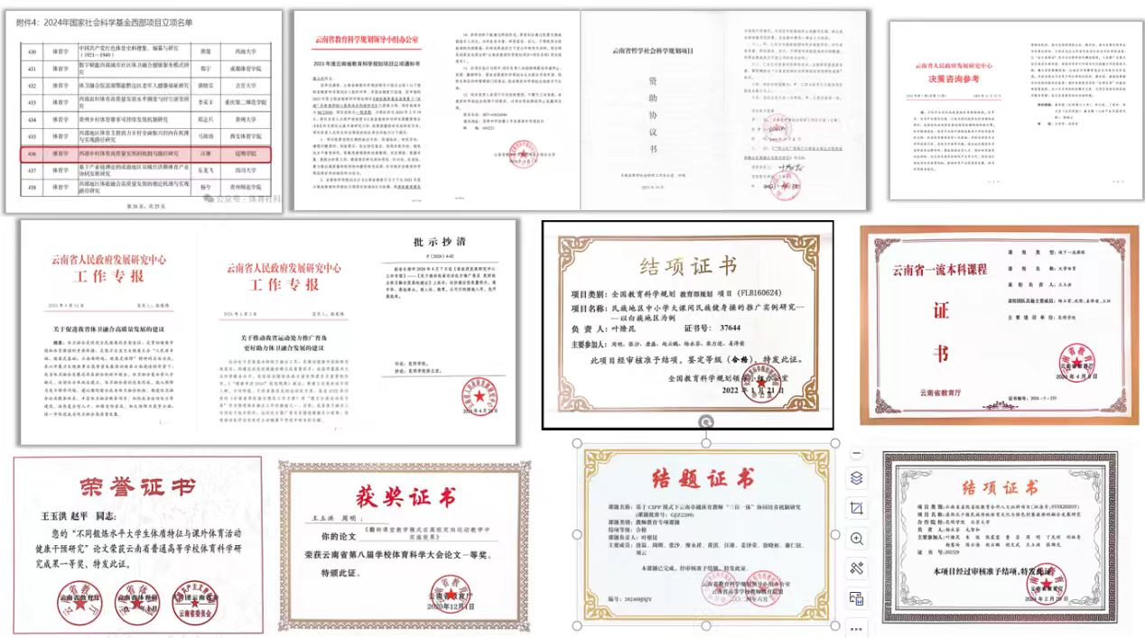 近年来,体育学院教师获国家社科基金1项、全国教育规划教育部课题1项、教育部人文社科1项、省院省校合作项目2项、教育部产学协同育人项目8项、云南省高校教师教育联盟课题1项、云南省哲学社会科学课题项目2项以及云南省教育厅、云南省学校体育教学指导委员会项目20余项;出版教材20余部,发表论文50篇,其中中科院一区TOP论文1篇,中文核心期刊10余篇(2篇被中国人大复印报刊资料全文转载);获全国体育科学大会专题报告3次,全国高校体育教师科学论文报告会一等奖2项,云南省学校体育科学论文报告会一等奖3项等。