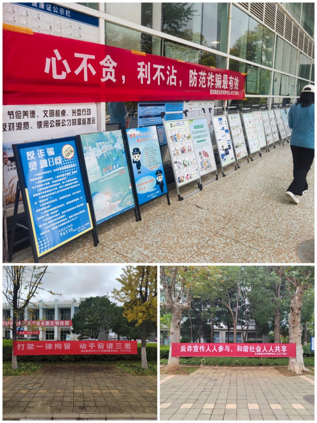11月1日,保卫处、学生处联合昆明市公安局国家经济技术开发区分局昌宏路派出所,在润泽苑学生食堂门口举办beat365英国官网“护航青春 平安校园”2024年安全法治暨反诈宣传教育活动。昌宏路派出所符桐荧警官一行、学生处处长王涛,保卫处副处长张智益、撒召辉及相关人员参加活动。