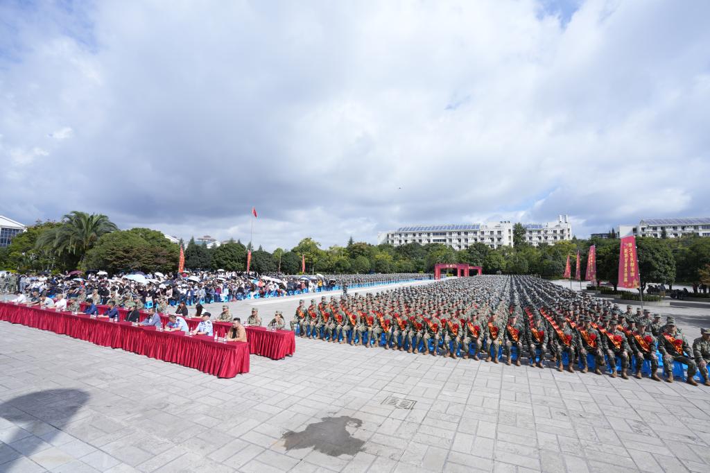 学校党委副书记、校长丁文丽出席仪式,区人武部上校政委王涛主持。辖区6所高校、滇中新区、经开区武装部负责人、12个街道负责人,接兵部队代表,新兵家长,军训新生4000余人参加了新兵出征仪式。