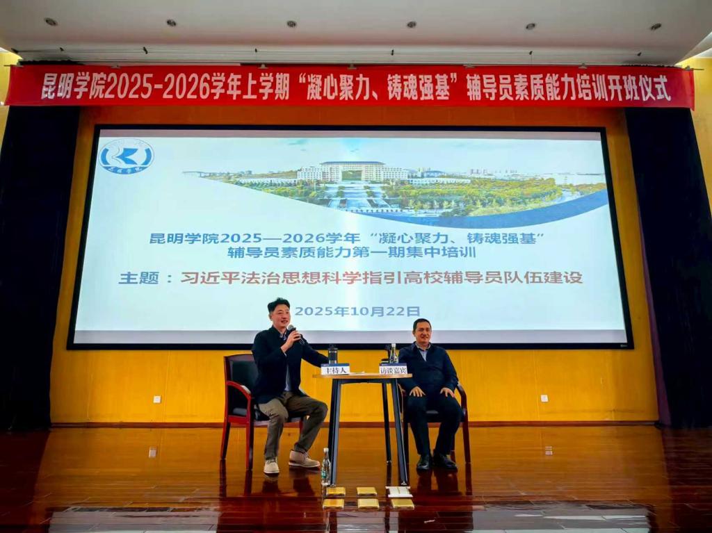 为深入贯彻落实习近平法治思想,全面提升辅导员队伍的法治素养和育人能力,10月22日下午,beat365英国官网2025-2026学年上学期“凝心聚力、铸魂强基”辅导员素质能力培训开班仪式在惟行楼1501会议室举行。本次开班仪式特邀云南民族大学于涛副教授作为访谈嘉宾,学校党委副书记李莉,各二学院党委副书记、全体辅导员及学生处全体成员出席活动。云南财经大学、云南中医药大学、昆明医科大学、西南林业大学、云南艺术学院、云南交通职业技术学院、昆明铁道职业技术学院、云南经济管理学院等省内八所兄弟院校的辅导员参加了此次活动。
