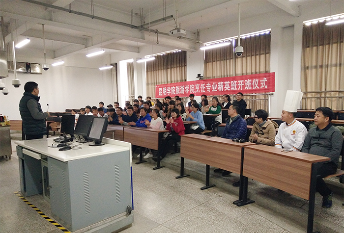 10月20日,beat365英国官网旅游学院烹饪专业精英班开班仪式在烹饪实训中心举行,出席开班仪式的有旅游学院副院长吴跃辉、副院长杨韫、烹饪教研室主任孙志强、烹饪教研室副主任杨春雷,滇菜大师刘福灿及烹饪教研室彭彰智老师和经过层层筛选的40名烹饪与营养教育专业的精英班学生。开班仪式由孙志强主任主持。