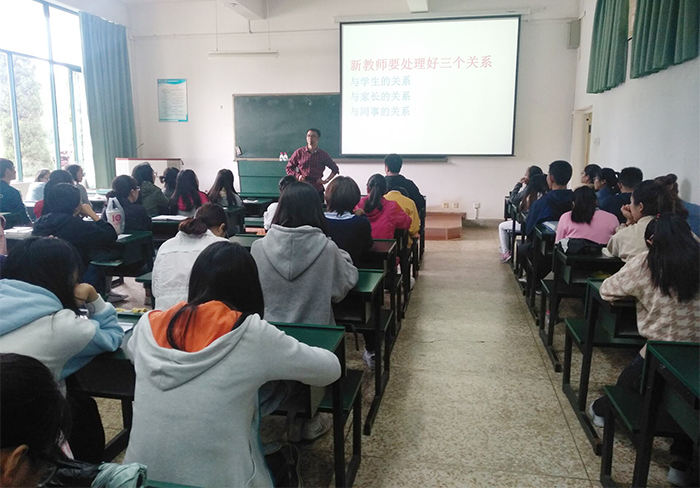 洪涛老师则带来了一场以“初为仁师的担当”为主题的讲座。他提醒大家,作为新教师要处理好与学生、家长和同事之间的关系。列举了学生喜欢和讨厌的老师形象,从而告诫同学们要成为一名学生眼中的好老师应具备的12种素质。通过教学案例详述了教师教学常规工作的基本要求。最后,他借用习近平总书记于2014年9月9日在北京师范大学,与师生代表进行座谈时发表的做“四有”好教师重要讲话为结语,祝愿同学们都能成为有理想信念、有道德情操、有扎实学识和有仁爱之心的“四有”好老师。
