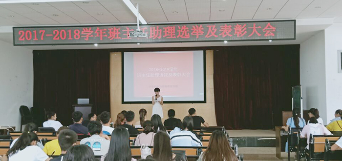 会上,表彰2017-2018学年8位优秀班主任助理,颁发荣誉证书,优秀班主任助理代表发言,谈了做班主任助理的乐与苦。随后举行2018-2019学年班主任助理竞选。48名选手参赛,竞选通过自我陈述、评委提问、综合打分等环节进行。经过激烈的角逐,10名同学成功获选2018级班主任助理。