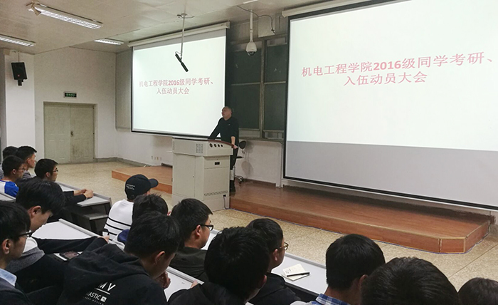 4月1日下午,机电工程学院召开学生考研、入伍动员大会。副院长何松林,副书记张大卫,副院长陈玲,辅导员路云和徐若瑜老师参加会议,并邀请到已考研成功和毕业入伍的学生来给同学们分享考研经验,宣传入伍政策。2016级学生全体学生及部分有考研、入伍意愿的近300名学生参会。