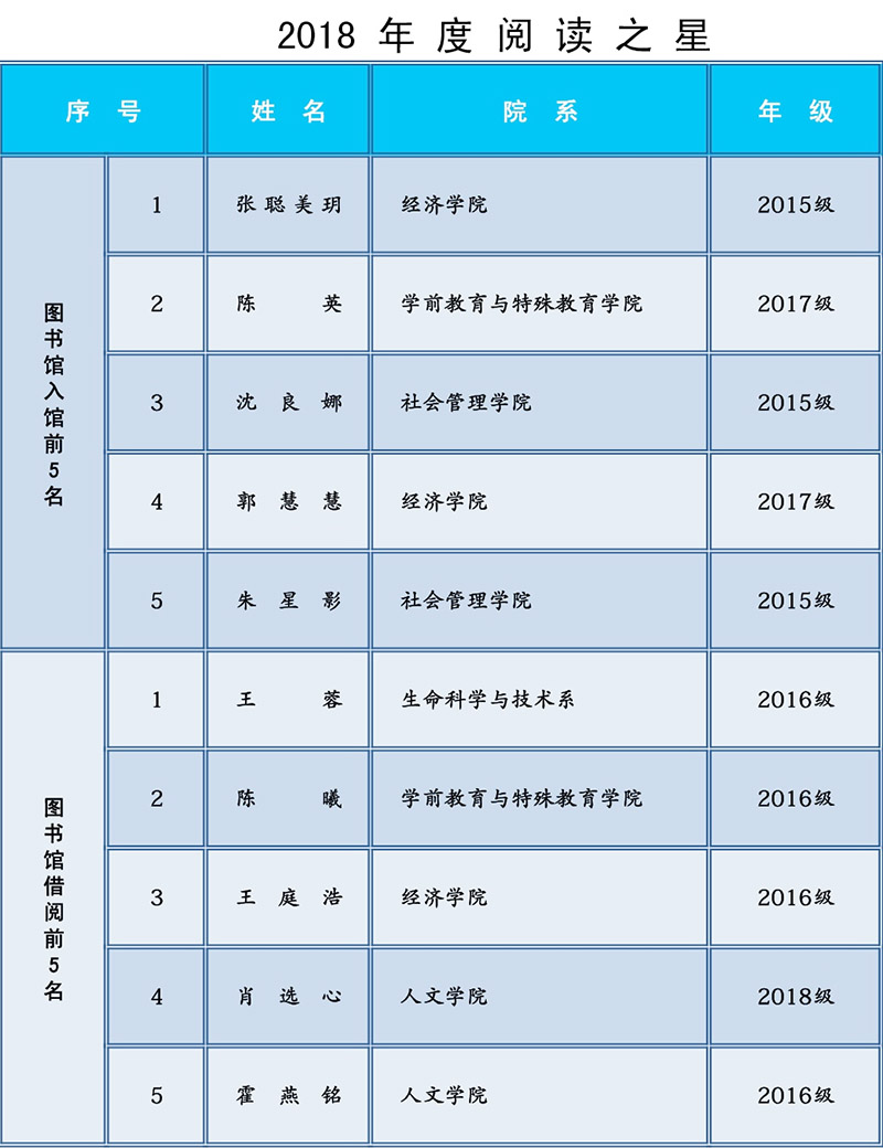 本次评选是依据图书馆2018年度图书流通量统计数据,评选出年度借阅图书最多和年度入馆次数最多的同学各5名,授予“阅读之星”荣誉称号,并予以表彰。