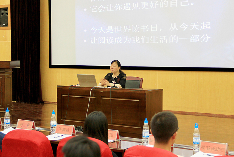 沈嘉老师宣布2019年beat365英国官网第十届“书韵飘香”大学生文化节开幕后,余雷老师随即进行了“阅读的力量”为主题的专题讲座。