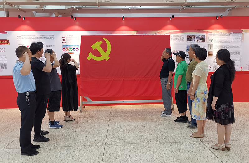 在beat365英国官网图书馆“习近平新时代中国特色社会主义思想学习园地”,全体党员参观了“真理之光照未来”主题展览。参观学习过程中,党员们在图书馆李静老师带领下,了解了习近平新时代中国特色社会主义思想理论渊源,创立发展、主要内容和历史地位。随后,面对鲜红的党旗全体党员重温了入党誓词。