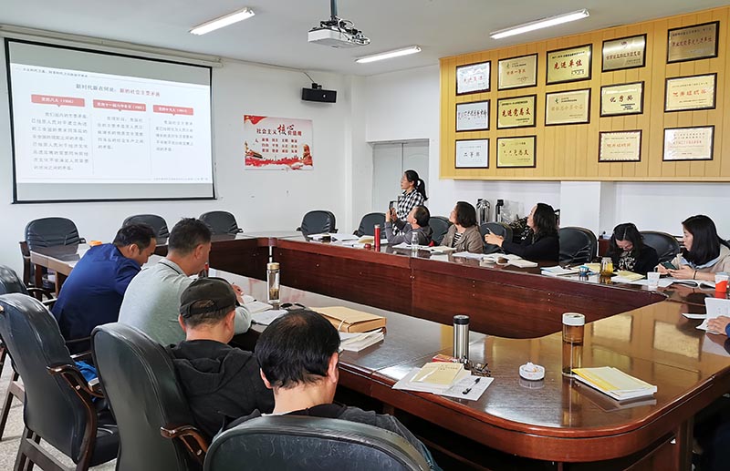 党支部书记林丽给党员们讲解习近平新时代中国特色社会主义思想,她讲到,习近平新时代中国特色社会主义思想是立足时代之基、回答时代之问的科学理论,写进党章、载入宪法,是党和国家必须长期坚持的指导思想,具有系统完备的科学体系、特色鲜明的理论品格,是经过实践检验、富有实践伟力的强大武器,是21世纪马克思主义、当代中国马克思主义。