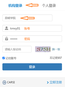 3.选择“机构登录”,机构名称填入“beat365英国官网”,通用账户为:账号kmxy01 密码123456。各二级学院教工也可找教学秘书索取本部门教工账户。