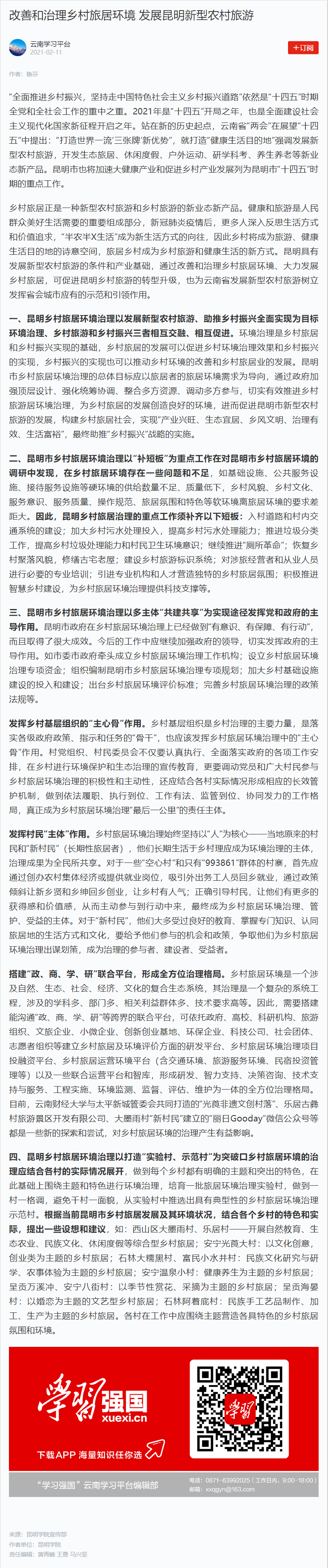改善和治理乡村旅居环境 发展昆明新型农村旅游
