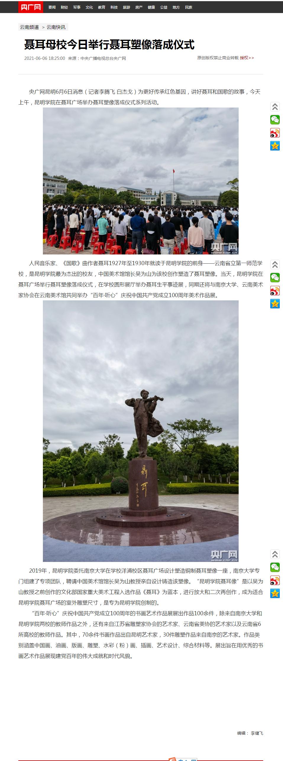 聂耳母校今日举行聂耳塑像落成仪式