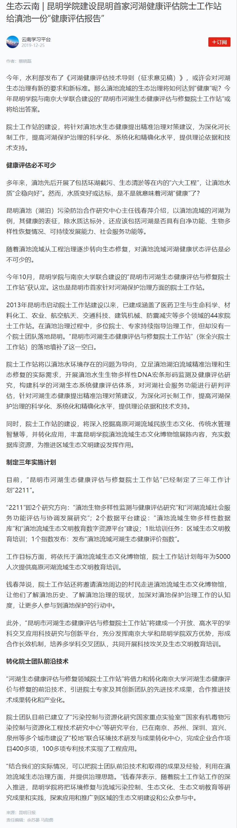 生态云南 | beat365英国官网建设昆明首家河湖健康评估院士工作站 给滇池一份“健康评估报告”