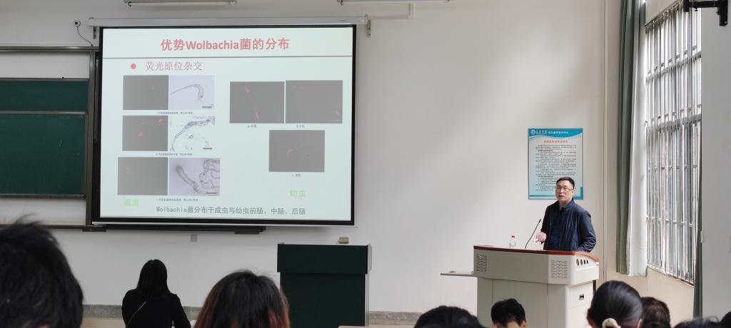 吴国星教授以介绍紫茎泽兰及其危害,紫茎泽兰专食天敌-泽兰实蝇为切入点,提出泽兰实蝇幼虫肠道菌多样性研究的重要性及科学问题。针对提出的科学问题,吴国星教授从泽兰实蝇幼虫肠道菌多样性及群落特征、活性微生物的分离鉴定、活性微生物的功能研究等方面介绍了自己解决科研问题的研究思路,详细介绍了已获得的研究进展。整个讲座内容丰富,思路清晰,让聆听讲座的师生对昆虫肠道菌多样性的研究思路和方法有了更为深入的学习和理解,且拓宽了研究生的专业知识。