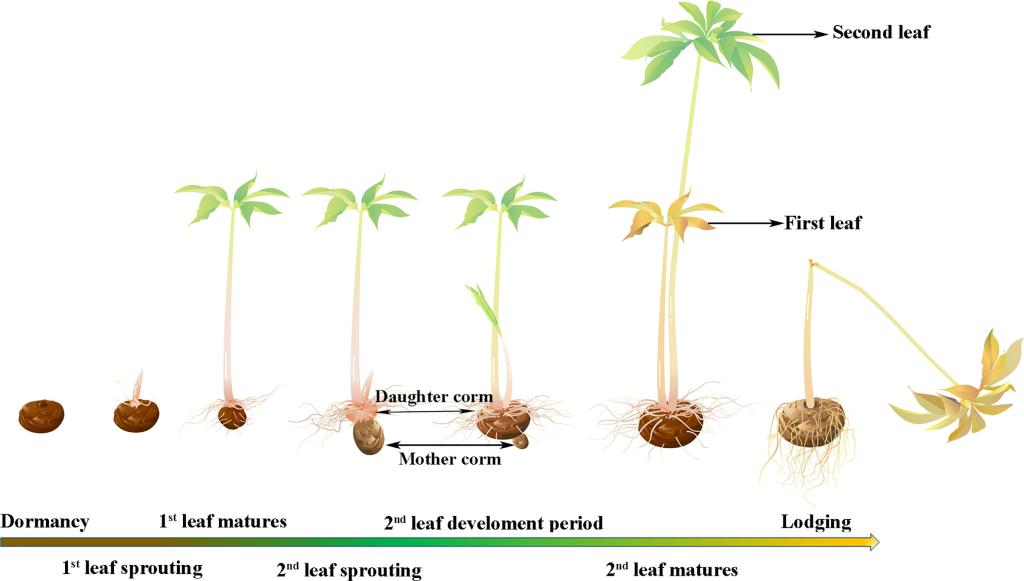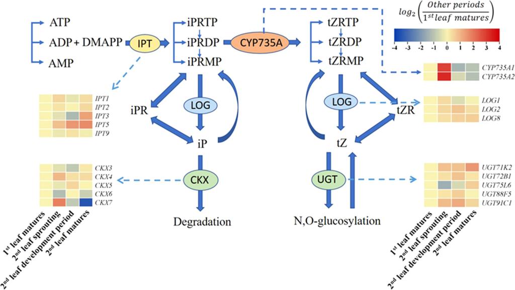 珠芽类魔芋(A. muelleri)在农业生产中具有典型的多苗接力生长特征,与传统花魔芋(A. konjac)及白魔芋(A. albus)具有明显不同,多苗接力生长模式有效提高了珠芽类魔芋球茎的膨胀系数,缩短了种植时间,具有重要的应用价值。然而,珠芽类魔芋如何实现多苗接力生长的机制尚不清楚。该研究通过不同发育时期激素组和转录组分析表明,正常生长期珠芽魔芋球茎中高浓度的反式玉米素核苷(trans-zeatin nucleoside,隶属于细胞分裂素)对其多苗生长起主要作用,同时其合成关键基因CYP735A1和CYP735A2的表达量显著提高,并明确了球茎中反式玉米素核苷合成部位来自根系,从而揭示了珠芽魔芋多苗接力生长的激素机制。此外,研究还发现另一类细胞分裂素异戊烯基腺苷(N6-(Δ2-isopentenyl) adenosine)和异戊烯基腺嘌呤(Isopentenyladenosine)可以显著促进珠芽魔芋球茎中不定芽和根生长。该研究为珠芽魔芋种植水平的进一步提升和资源高效利用提供了科学依据。