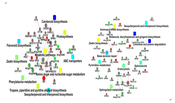 工业大麻是喜光植物,对光响应较敏感,光质直接影响大麻的产量和质量。本文首次利用DIA蛋白质组学技术研究大麻在红光和蓝光下的蛋白响应机制,共鉴定出7591个蛋白质,红光~白光和蓝光~白光下分别鉴定出421和456个差异蛋白,蓝光处理下的上调蛋白远多于红光处理。不同光质下,红光~白光下差异蛋白功能富集主要在脂质代谢、核苷酸代谢、萜类和多酮类化合物的代谢等;蓝光~白光下差异蛋白功能富集主要在萜类和多酮类化合物的代谢等。通过分析参与pathway和共表达差异蛋白发现,蓝光下工业大麻主要通过以下机制促进工业大麻生长:1.DNA修复能力增强。2.类胡萝卜素大量合成,光合速率提升。3.生长素合成和淀粉积累速率增强。4.木质化速度加快,植株营养生长加快。而红光下工业大麻则表现出:1.RNA剪切体途径受到抑制,细胞有丝分裂受阻。2.DNA受到损伤,复制受阻,同时DNA修复能力受到抑制。3.电子载体、单加氧酶活性降低,细胞代谢能力降低。4.细胞活性氧含量增加,同时植株抗氧化物酶活性升高。5.气孔关闭,光合能力降低。6.叶绿体和细胞内膜分解,细胞程序性死亡。7.根部生长、植株生长分化受到抑制。实验结果可为光质调控在工业大麻工厂化的应用提供理论依据。