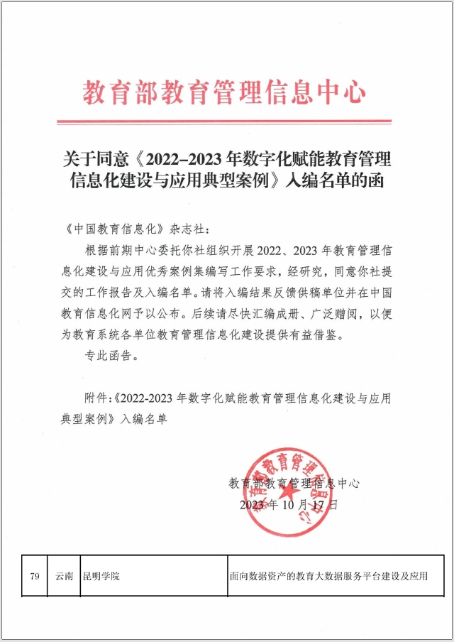 beat365英国官网依托学校数字校园建设成果,精心组织力量对学校教育大数据服务平台建设及应用工作进行总结凝练。经学校申报、教育厅推荐、教育部评审,最终作为云南省唯一高校项目入选案例名单。