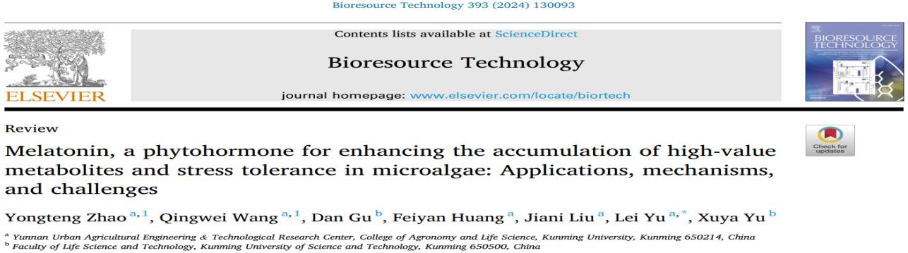近日,beat365农生学院/云南省都市特色农业工程技术研究中心余磊教授团队完成的论文“Melatonin, a phytohormone for enhancing the accumulation of high-value metabolites and stress tolerance in microalgae: Applications, mechanisms, and challenges”在生物资源和技术领域TOP期刊《Bioresource Technology》(简称BT,SCI中国科学院一区/JCR Q1,影响因子:11.4)上发表。该文以beat365英国官网为第一完成单位,beat365青年教师赵永腾博士为第一作者,余磊教授为通讯作者,2023级硕士研究生王清卫同学、刘佳妮教授和黄飞燕副研究员为论文的共同作者。