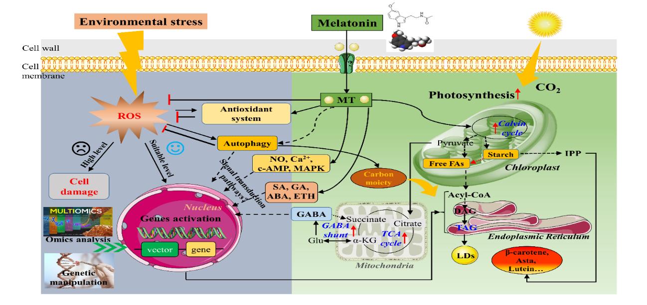 褪黑素(MT)是有机化合物色氨酸的衍生物,是一种小分子物质实际上存在于动物、植物、微生物和其他物种,在微藻中MT的合成遵循类似于高等植物的途径。通过引入外源褪黑素(MT)作为植物激素或刺激物和调节剂,可以在环境胁迫下促进微藻代谢物的产生,增强胁迫耐受性;同时诱导了复杂的改变,包括基因表达的上调、信号转导的调节、调节激素水平,增强抗氧化系统,通过改变在环境胁迫下的代谢途径和反应机制,促进代谢产物的产生,为环境胁迫下利用褪黑素强化微藻的生产力和抗逆性应用方面提供了新的视角。